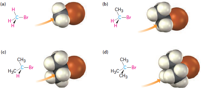 Figure 1.1 Steric hindrance to the SN2 reaction. As the models indicate, the carbon atom in (a) bromomethane is readily accessible, resulting in a fast SN2 reaction. The carbon atoms in (b) bromoethane (primary), (c) 2 bromopropane (secondary), and (d) 2-bromo- 2-methylpropane (tertiary) are successively more hindered, resulting in successively slower SN2 reactions.