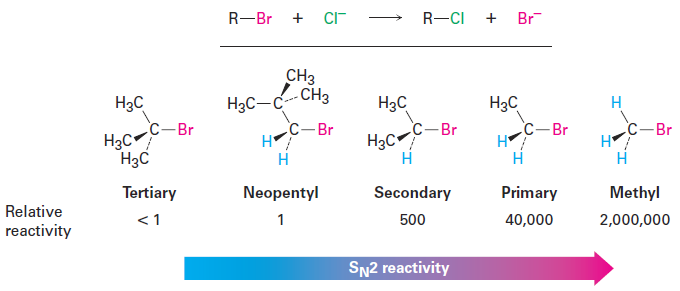 As a result, SN2 reactions occur only at relatively unhindered sites and are normally useful only with methyl halides, primary halides, and a few simple secondary halides. Relative reactivities for some different substrates are as follows: