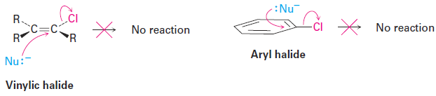 Vinylic halides (R2C= CRX) and aryl halides are not shown on this reactivity list because they are unreactive toward SN2 displacement. This lack of reactivity is due to steric factors: the incoming nucleophile would have to approach in the plane of the carbon–carbon double bond and burrow through part of the molecule to carry out a backside displacement.