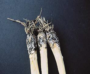 النباتات المصابة تكون في شكل بقع متناثرة بالحقل وتظهر الأعراض في صورة اصفرار ثم ذبول وموت الأوراق من قمة الورقة لأسفلها ومن الأوراق الخارجية المسنة إلى الأوراق الداخلية الحديثة. وتظهر على الجذور تحت سطح التربة أعفان وعند اقتلاع النباتات المصابة يشاهد على الأبصال المصابة نمو أبيض قطني وتتكون عليها أجسام حجرية سوداء صغيرة في حجم رأس الدبوس.