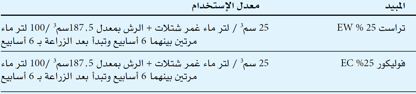 يمكن أن يبدأ العلاج بعد شهر من الزراعة على أن يكرر الرش بعد 15 يوم من الرشة الأولى عند الضرورة.