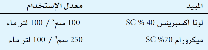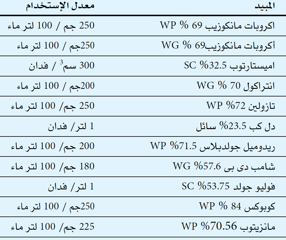 إجراء الرش بعد 45-60 يوم من الزراعة أو عند بداية الإصابة أو توفر الظروف البيئية المناسبة: