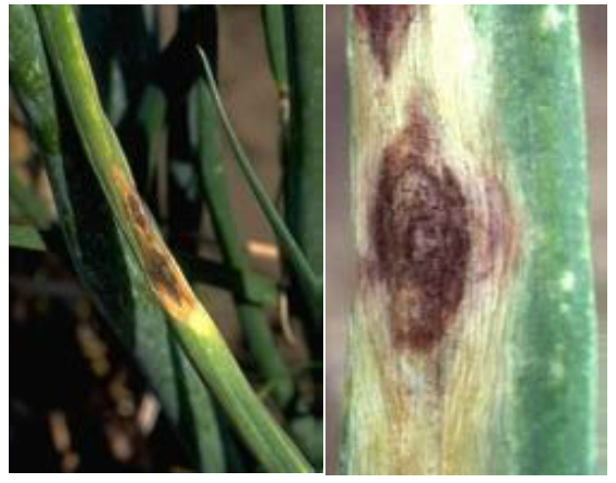 بقع بيضاوية أو مطاولة أسطوانية الشكل مختلفة الحجم ذات لون أخضر شاحب - وتظهر جراثيم الفطر الأرجوانية على سطح البقع - لا تقوى الشماريخ على حمل النورات وتلتوى وتأخذ شكل رقبة الإوزة في البصل المروى.