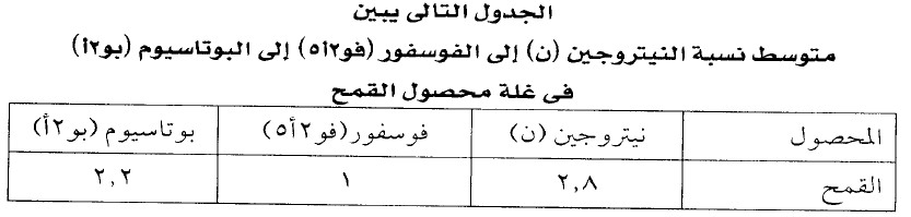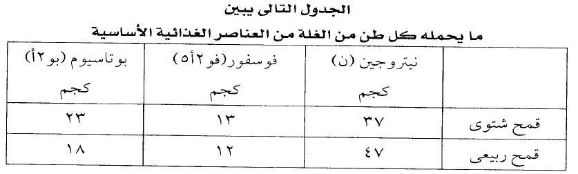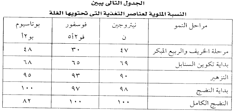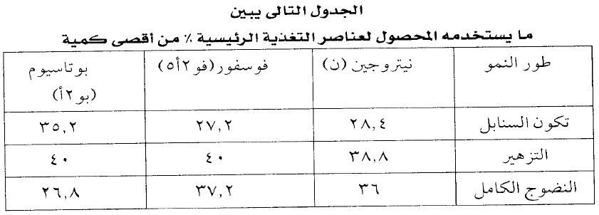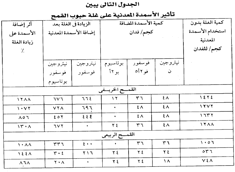من الجدول نجد ان كل كجم من النيتروجين والفوسفور والبوتاسيوم يعطي من 7-10 كجم حبوب ويرجع الدور الاول للحصول على غلة عالية من الحبوب الى النيتروجين اولا ثم يليه الفوسفور ثم يليه البوتاسيوم.