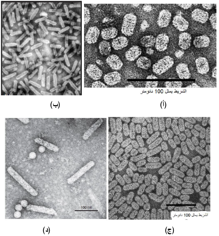 الشكل(4): الجسيمات الباسيلية (أ) لفايروس من الجنس Ourmiavirus (ب) لفايروس من الجنس Baldnavirus (ج) لفايروس موزائيك الجت (AMV) (د) لفايروس تدهور الرز (RTBV) مع ملاحظة وجود عدد من الاجسام الكروية وهي للجسيمات الفايروسية التي صورت من الأعلى.