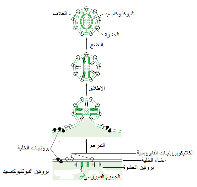 الشكل (7): آلية التبرعم Budding التي تفسر تغليف الفايروسات المغلفة بالغلاف الليبيدي المزدوج ذو المنشأ الخلوي خلال عبورها أغشية خلايا العائل.