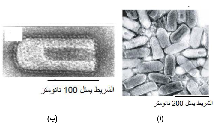الشكل (5): الجسيمات الشبيه بالإطلاقة المكورة من جهة والمستقيمة من الجهة الأخرى (أ) لفايروس الاصفرار التماوتي للخس (LNYV) (ب) لفايروس التبقع الأحمر لأوراق الليليا (LRLV)، (الشريط يمثل 100 نانومتر).