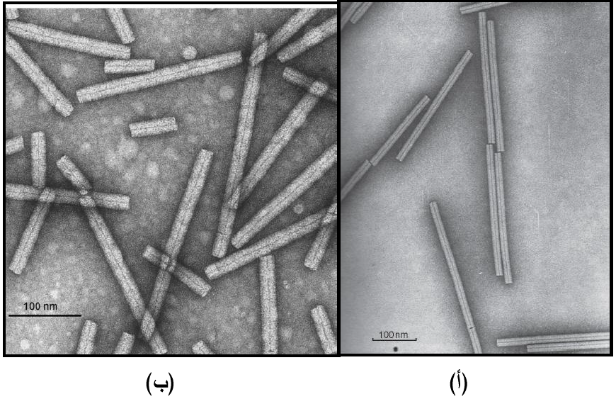 الشكل (1): الجسيمات الفايروسية العصوية الصلدة الأنبوبية المشاهدة بالمجهر الإلكتروني والمصبوغة بطريقة الصبغ السالب (أ) لفايروس موزائيك التبغ (TMV) (ب) لفايروس الاصفرار التماوتي لعروق البنجر (BNYVV).