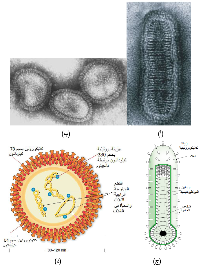 الشكل (6): الفايروسات المغلفة (أ) جسيمة مغلفة عصوية معقدة تمثل فايروسات الرابدو Rhabdoviridae مصورة بالمجهر الالكتروني (ب) جسيمة مغلفة كروية معقدة مصورة بالمجهر الالكتروني (ج) مخطط لمقطع في جسيمة لفايروس رابدو المغلفة العصوية (د) مخطط لمقطع في جسيمة لفايروس من فايروسات التوسبو Tospoviruses المغلفة الكروية.