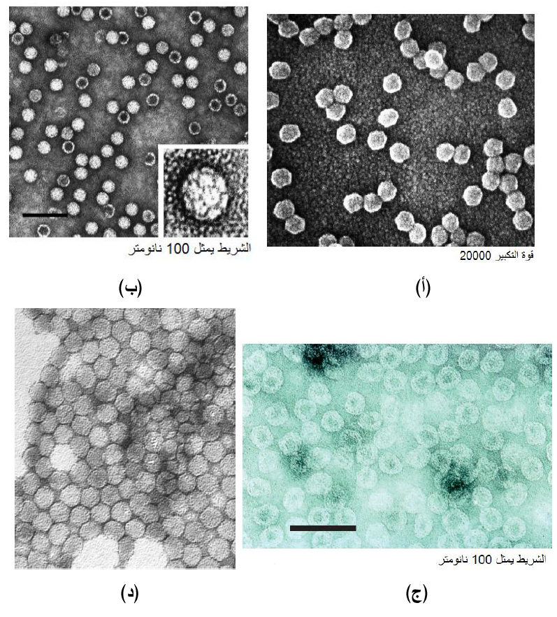 الشكل (3): أنواع من الفايروسات الأيزومترية (أ) الجسيمات البلورية لفايروس التقزم الاصفر للشعير(BYDV) (ب) فايروس تبرقش البيلادونا (BeMV) حيث يظهر الشكل الجسيمات الكاملة وعدد من الجسيمات الفارغة من الحامض النووي ذات المركز الغامق بسبب دخول الصبغة فيها، والصورة المكبرة إلى اليمين لجسيمة مكبرة تظهر فيها الكابسوميرات (ج) الجسيمات الكروية لفايروس التقزم الشجيري للعليق (RBDV) (د) الجسيمات البلورية لفايروس التبرقش الاصفر للذرة (MCMV) (ه) شكل مجسم للتركيب السطحي لفايروس موزائيك البروم يظهر الكابسوميرات الخماسية والسداسية (و) شكل مجسم لكابسيد فايروس التبرقش الاصفر للرز (RYMV) يظهر تكونه من أكثر من نوع من البروتينات وترتيب شبه مكافئ.