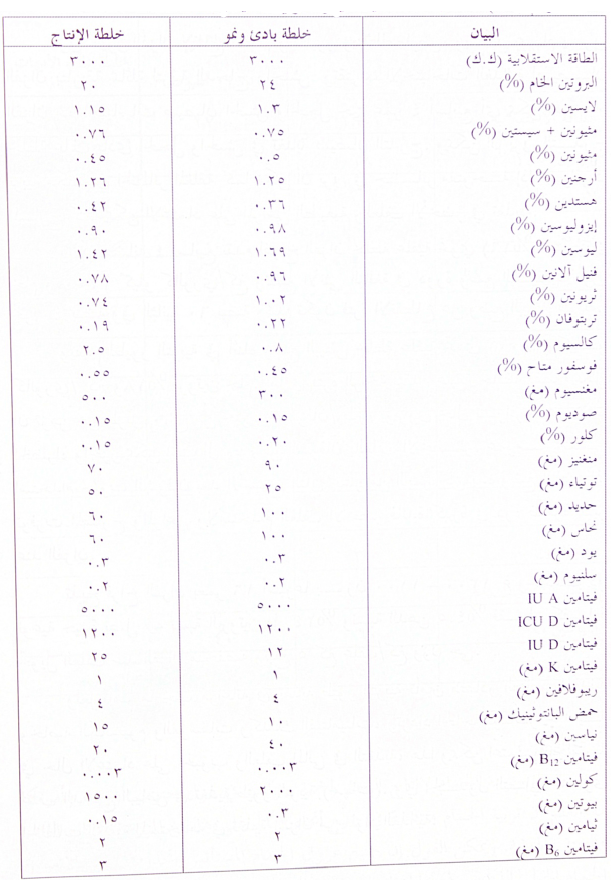 الجدول رقم (2): المتطلبات الغذائية لطيور الفري النامية والمنتجة
