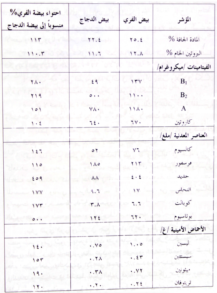 الجدول (1): مقارنة بين بيض الدجاج وبيض الفري من حيث احتواء كل منهما من الفيتامينات والعناصر المعدنية والاحماض الامينية