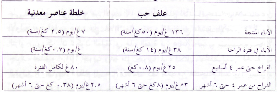 جدول يبين استهلاك الحبوب والعناصر المعدنية عند الحمام في مراحل التربية المختلفة
