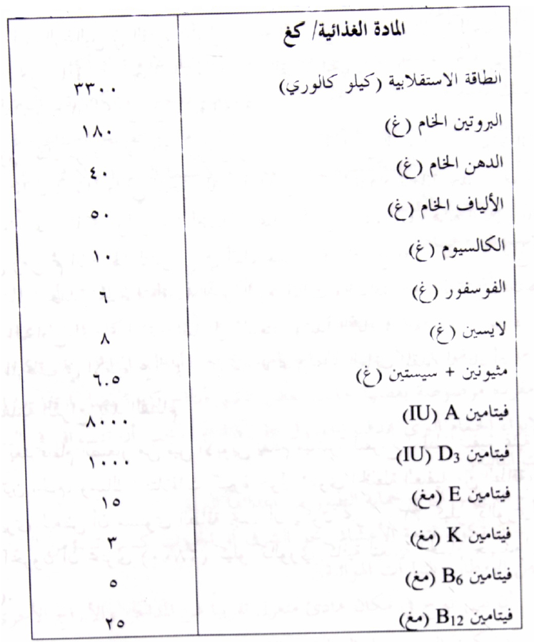 جدول يبين محتوى المواد الغذائية في خلطة علف الحمام/ كغ