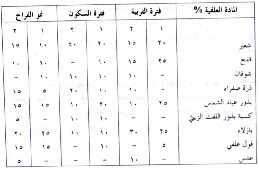 جدول يتضمن بعض نماذج من الخلطات العلفية للحمام