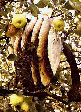 كما يمكن ملاحظة ذلك السلوك عند بناء طرد النحل للأقراص الشمعية في الطبيعة، حيث نجد أن الشغالات تبدأ بتثبيت بداية القرص الشمعي من أعلى، سواء أكان على فرع شجرة أم في تجويف حائط، تثبيتاً متيناً، وتكون جدر العين السداسية عند منطقة الاتصال سميكة نوعاً ما؛ حتى تتحمل ثقل القرص عند تخزين العسل فيه، ويكون الطرف السفلي سائباً تاركاً مسافة بينه وبين القاع لمرور النحل منها، ويبدأ الطرد في بناء قرص واحد أولاً، ثم بعد ذلك قرصين أو أكثر على كل جانب من القرص الأول، وموازياً له كما في شكل التالي.