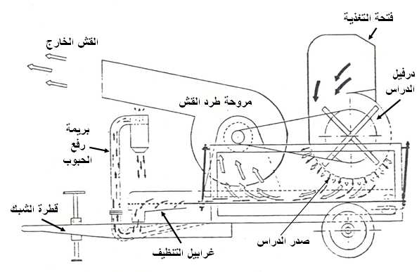 تقوم آلات الدراس بفصل الحبوب من أغلفتها وتنظيف الحبوب من القش وبالتالي تسهل تعبئتها في أجوله، وسواءًا كانت محلية (شكل 1، 2) أو مستوردة فإنها تتكون من الأجزاء التالية: