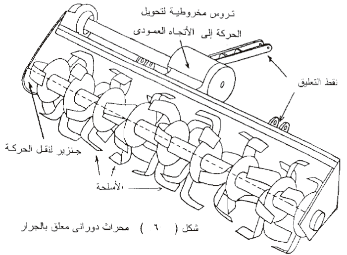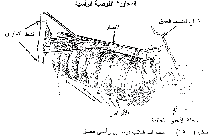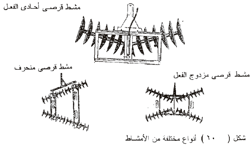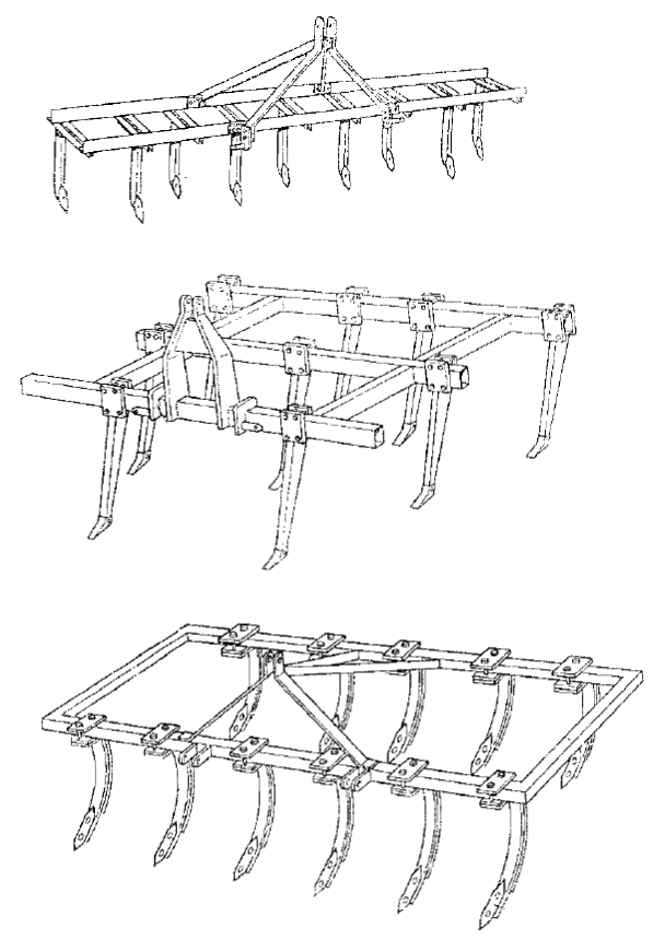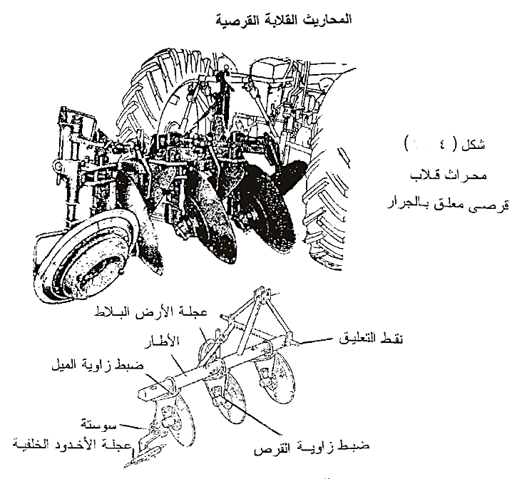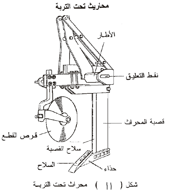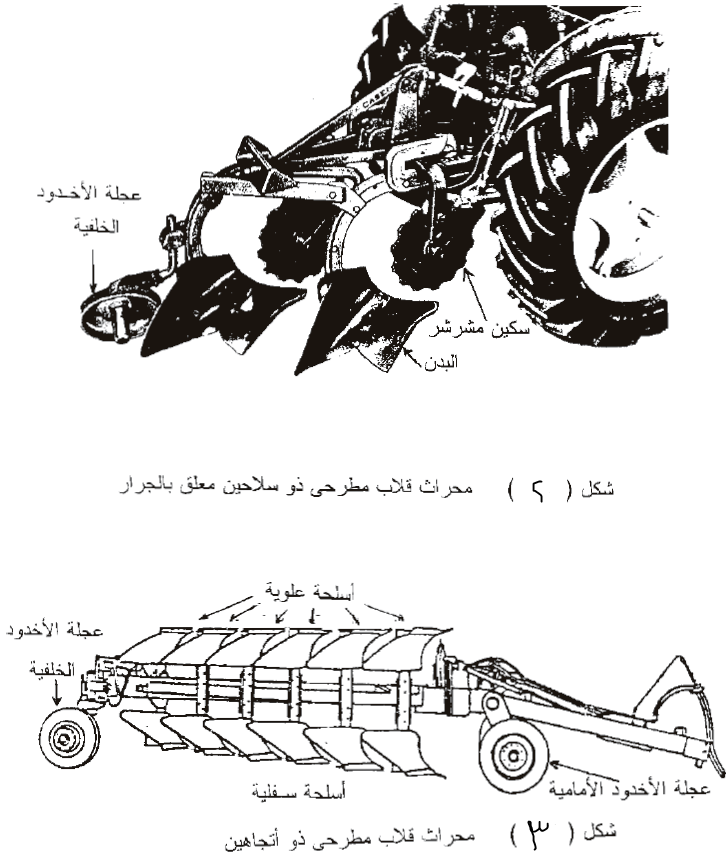 ويوجد من هذه المحاريث أنواع عديدة شكل (۱) تختلف طبقا لطريقة اتصالها بالجرار وطبقا لعرض المحراث والمسافة بين القصبات وشكل القصبات وهل هي مرنة أم صلبة، ونوع وأبعاد الأسلحة.