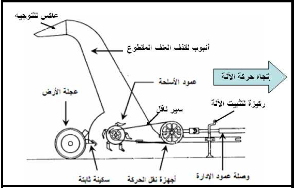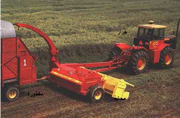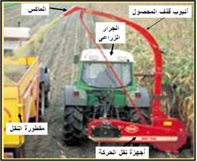 ٤- أنبوب: يمر بداخله العلف المقطع وينتهى بعاكس لتوجيه المحصول لمقطورة النقل.