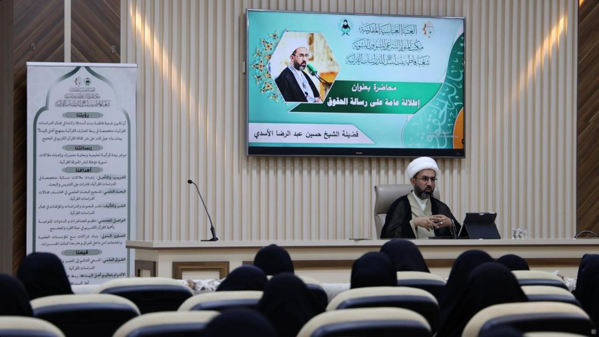 نظمت شعبة فاطمة بنت أسد (عليها السلام) للدراسات القرآنية، التابعة لمكتب المتولي الشرعي للشؤون النسوية في العتبة العباسية المقدسة، محاضرة بعنوان "إطلالة عامة على رسالة الحقوق". وقالت مسؤولة الشعبة السيدة فاطمة الموسوي إنَّ "الشعبة نظمت محاضرة حول المضامين التربوية لرسالة الحقوق للإمام زين العابدين (عليه السلام)، وحاضر فيها الشيخ حسين عبد الرضا الأسدي، الذي استعرض أهمية الرسالة بوصفها منظومة أخلاقية متكاملة، ومن أقدم الوثائق التي تناولت موضوع الحقوق والواجبات في الإسلام وأهمها". وأضافت أنَّ "المحاضرة شهدت حضور طالبات المدرسة القرآنية، إلى جانب عدد من منتسبات الشعب النسوية في العتبة المقدسة ووفد من جامعة كربلاء".