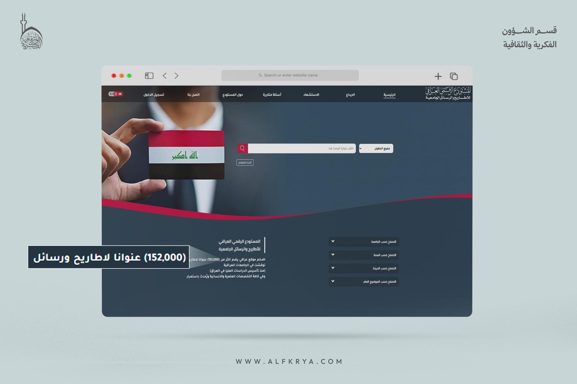 يُواصل قسم الشؤون الفكرية والثقافية في العتبة العباسية المقدّسة، تطوير مشروع المستودع الرقميِّ العراقي للأطاريح والرسائل الجامعية، الذي أصبح اليوم قاعدة بيانات وطنية متكاملة تضمُّ أكثر من 152 ألف أطروحةٍ ورسالة بمختلف الاختصاصات. وقال معاون مدير مركز المعلومات الرقمية التابع للقسم، السيد صالح الحسناوي، إنَّ "المستودع الرقمي العراقي يُعد دليلًا موثقًا لنشاط الجامعات العراقية، فهو اليوم يحتوي على أكثر من 152,000 أطروحة ورسالة جامعية جُمعت ووُثّقت خلال السنوات الخمس الماضية، منذ انطلاق المشروع عام 2019م". وأضاف أنَّ "فكرة المشروع جاءت بعد إعداد دراسة مستفيضة من قِبل مركز المعلومات الرقمية، بهدف إنشاء موقع إلكترونيٍّ يجمع الأطاريح والرسائل التي نوقشت في الجامعات العراقية منذ تأسيس الدراسات العليا في البلاد، ليكون دليلًا شاملًا يُسهّل الوصول إلى هذا الإرث العلمي الثري، ويسهم في نشر المعرفة الأكاديمية على نطاق واسع".