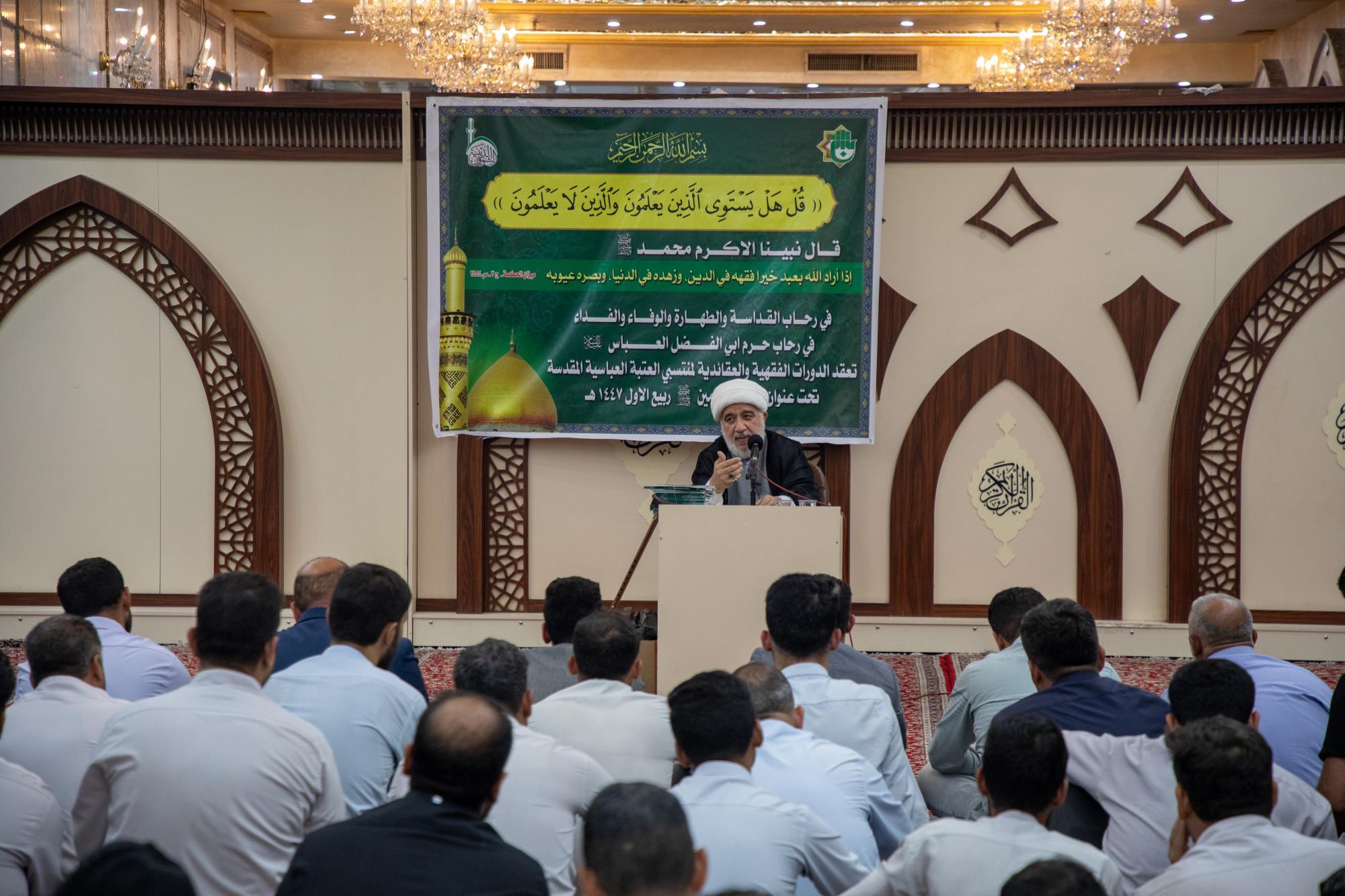 اختتم قسم الشؤون الدينية في العتبة العباسية المقدسة الدورة الدينية الخامسة المقدمة للمنتسبين. وقال معاون رئيس القسم الشيخ عادل الوكيل "أكملنا اليوم الدورة الدينية التي تأتي ضمن مجموعة دورات استمرت شهرين بمشاركة نحو 600 منتسب من مختلف أقسام العتبة المقدسة". وأضاف، أنَّ "الدورة الواحدة تستمر ثلاثة أيام، وفي اليوم الرابع يكون هنالك اختبار لمعرفة مدى استفادة المشاركين من المعلومات المقدمة لهم، إذ تتضمن الدورات جوانب عملية ونظرية حول كيفية الصلاة والوضوء والتيمم والغسل، والجانب النظري في أصول الدين وفروعه وغيرها من المسائل".
