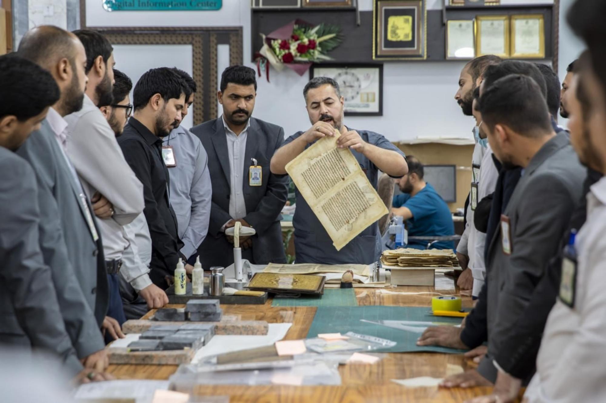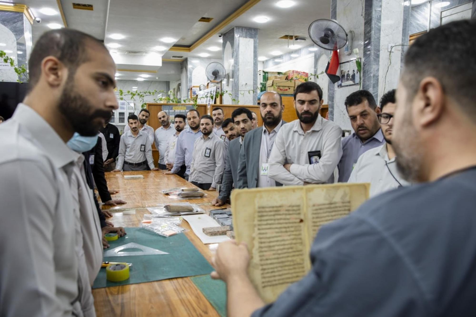 استعرض قسم الشؤون الفكرية والثقافية في العتبة العباسية المقدسة آلية حفظ التراث المخطوط للمشاركين في البرنامج المركزي الأسبوعي لمنتسبي العتبة المقدسة. وقال مدير مركز الفضل لصيانة وحفظ التراث المخطوط والأرشيف الوثائقي التابع للقسم، السيد ليث لطفي: إنّ "المشاركين في البرنامج المركزي الأسبوعي من منتسبي العتبة العباسية المقدسة تعرفوا في زيارتهم للمركز إلى طبيعة الجهود المبذولة في صيانة المخطوطات النادرة والوثائق التاريخية، وآليات حمايتها من عوامل التلف، إلى جانب الاطلاع على مراحل الترميم التي يعتمدها المركز في مشاريعه". وأضاف أنّ "الهدف من هذه الزيارات هو تعزيز الوعي بأهمية حفظ الإرث العلمي والثقافي، وصون الذاكرة التاريخية للمؤسسات الدينية والثقافية، بوصفها مكونًا أساسيًّا في الهوية الحضارية للعراق".