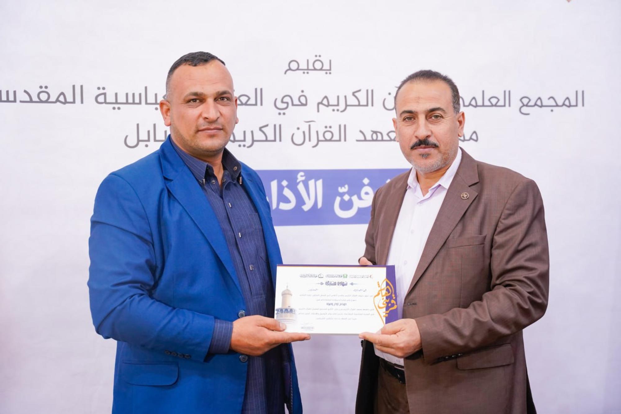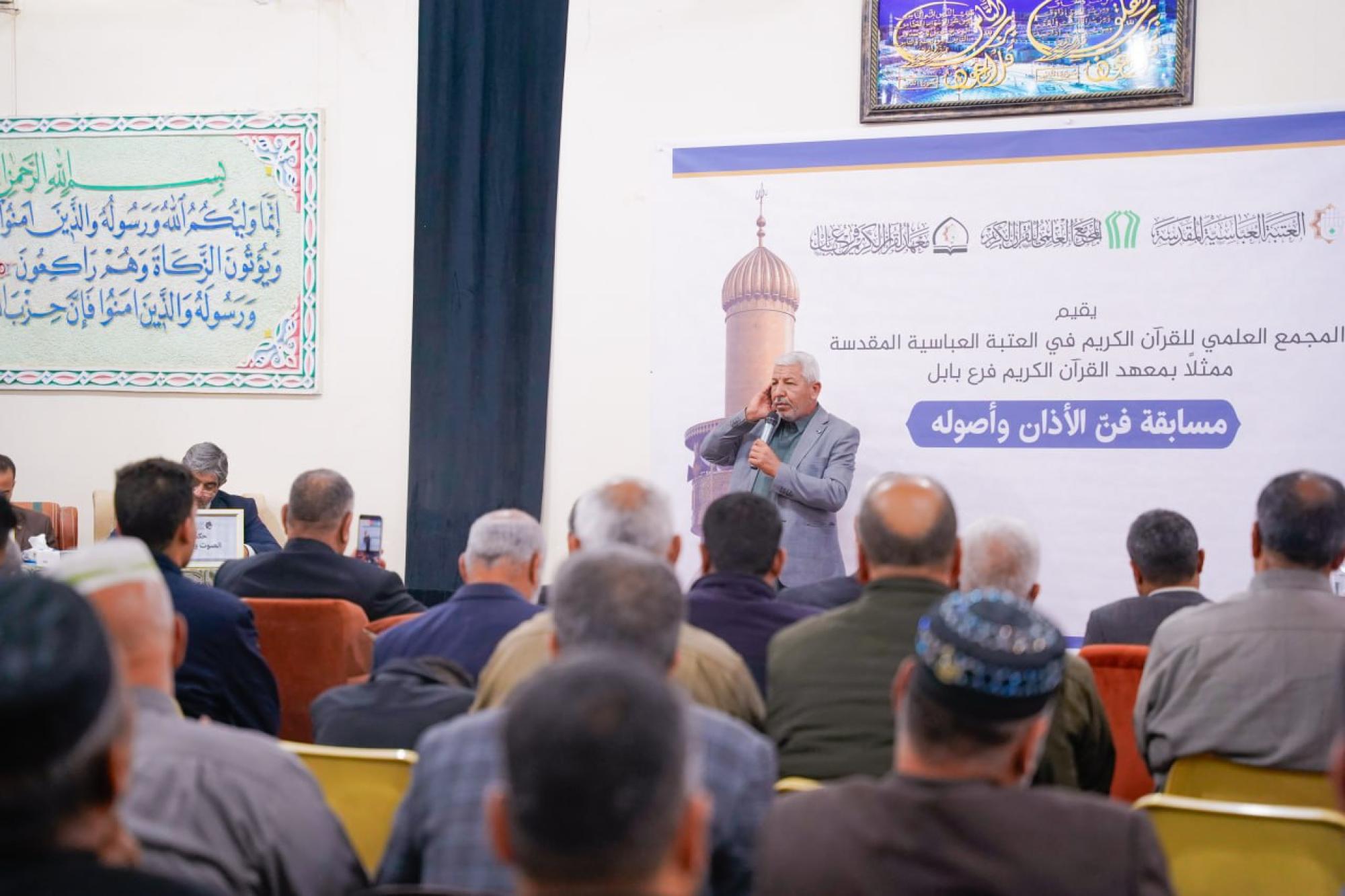 اختتم المَجمَعُ العلميّ للقرآن الكريم في العتبة العبّاسية المقدّسة، دورة فنّ الأذان وأصوله في ناحية سدّة الهندية بمحافظة بابل. وقال مسؤولُ معهد القرآن الكريم فرع بابل السيد منتظر المشايخي، إن "المعهد اختتم دورة فنّ الأذان وأصوله، بإقامة احتفاليّةٍ تضمّنت مسابقة تطبيقية، أسفرت نتائجها عن فوز المتسابق عبد الله عزيز إبراهيم بالمركز الأوّل، فيما نال المتسابق نبيل حسين سعيد المركز الثاني، وحلّ المتسابق مصطفى يعقوب داود في المركز الثالث، وذلك يعكس مستوى الجهد والتدريب الذي تلقّاه المشارِكون طوال أيّام الدورة".