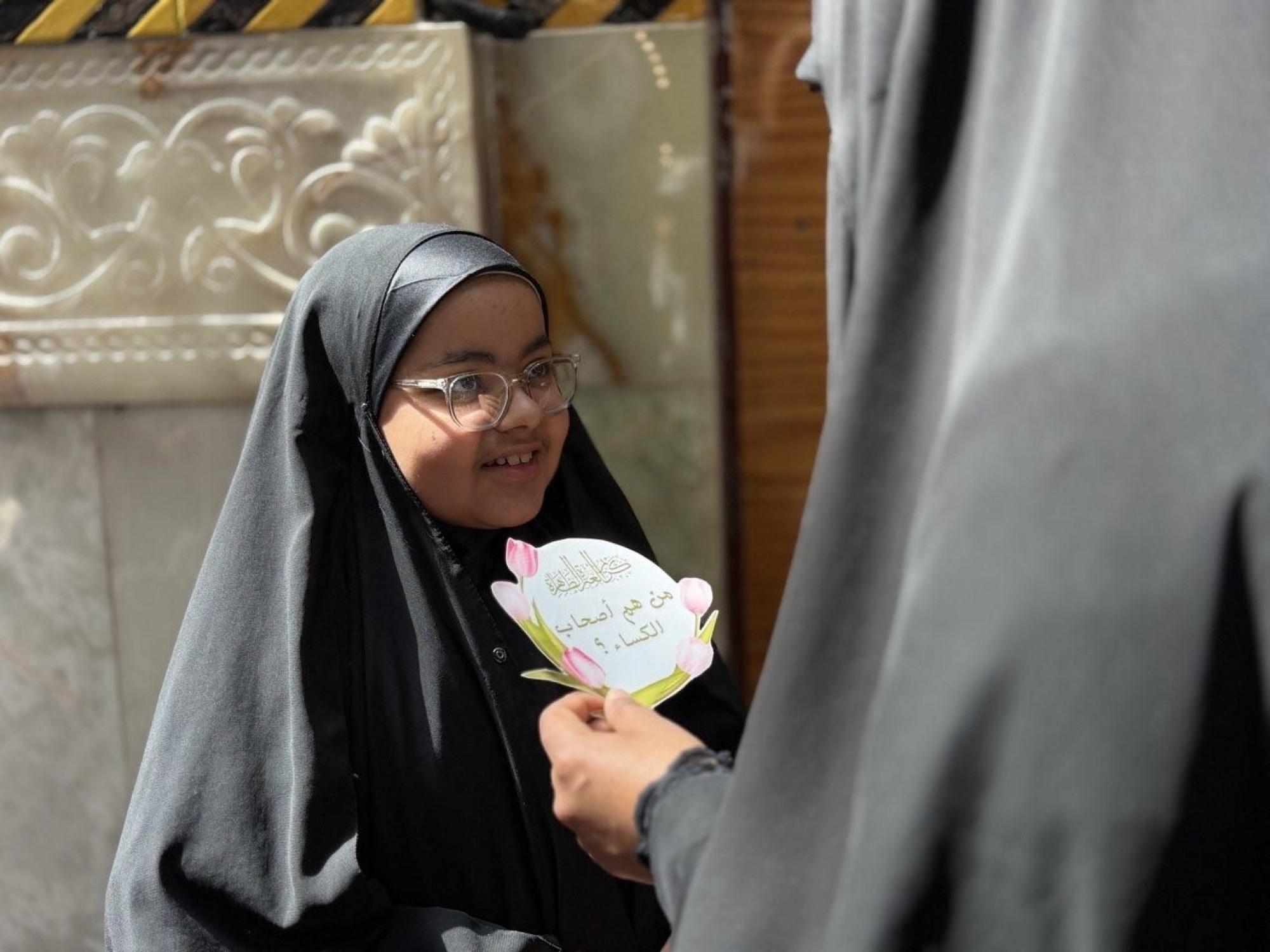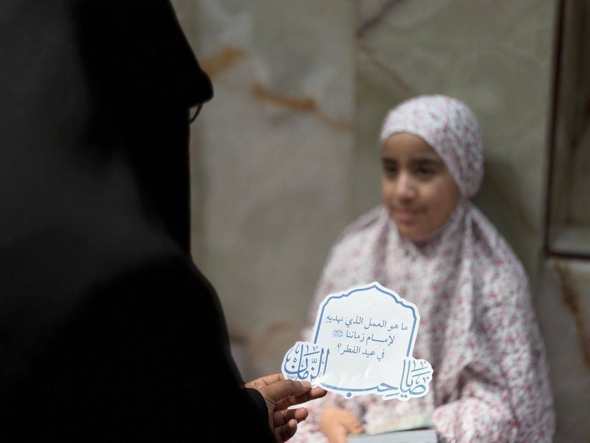 نظّمت شعبةُ التوجيه الدينيّ النسويّ التابعة لمكتب المتولّي الشرعيّ للشؤون النسوية في العتبة العبّاسية المقدّسة، مسابقتها الميدانية (براعم السقّاء) للأطفال، بالتزامن مع أيام عيد الفطر المبارك. وقالت مسؤولةُ الشعبة السيدة عذراء الشامي: إن "المسابقة استهدفت الأطفال من داخل البلد وخارجه، لإشراكهم في أجواء العيد العبادية في صحن مرقد أبي الفضل العباس(عليه السلام)". وأضافت أن "المسابقة تضمّنت طرح أسئلةٍ حول أهمّية إحياء العيد بأجواءٍ إيمانية، وكيفيّة إدخال السرور على قلب الإمام المهديّ(عجّل الله فرجه)، فضلاً عن توزيع الهدايا على المشاركات".