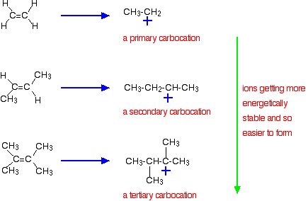 The more negatively charged that region becomes, the more it will attract molecules like hydrogen chloride. The more important reason, though, lies in the stability of the intermediate ion formed during the reaction. The three examples given above produce these carbocations (carbonium ions) at the half-way stage of the reaction: