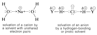 Actually, two factors are relevant in regard to the ionizing ability of solvents. First, a high dielectric constant increases ionizing power by making it easier to separate ions. This is because the force between charged particles varies inversely with the dielectric constant of the medium. Thus water, with a dielectric constant of 80, is 40 times more effective than a hydrocarbon with a dielectric constant of 2. Second, and usually more important, is the ability of the solvent to solvate the separated ions. Cations are solvated most effectively by compounds of elements in the first row of the periodic table that have unshared electron pairs. Examples are ammonia, water, alcohols, carboxylic acids, sulfur dioxide, and methylsulfinylmethane [dimethyl sulfoxide, (CH3)2SO]. Anoins are solvated most efficiently by solvents having hydrogen attached to a strongly elecronegative element Y so the H−Y bond is strongly polarized as Hδ⊕⋅⋅⋅Yδ⊖. Such solvents usually are called protic solvents. Protic solvents form hydrogen bonds to the leaving group, which assist ionization in much the same way that silver ion catalyzes ionization of alkyl halides. We can represent solvation by the following structural formulas, but it must be recognized that the number of solvent molecules involved in close interacitons can be as large as four or six, or as small as one: